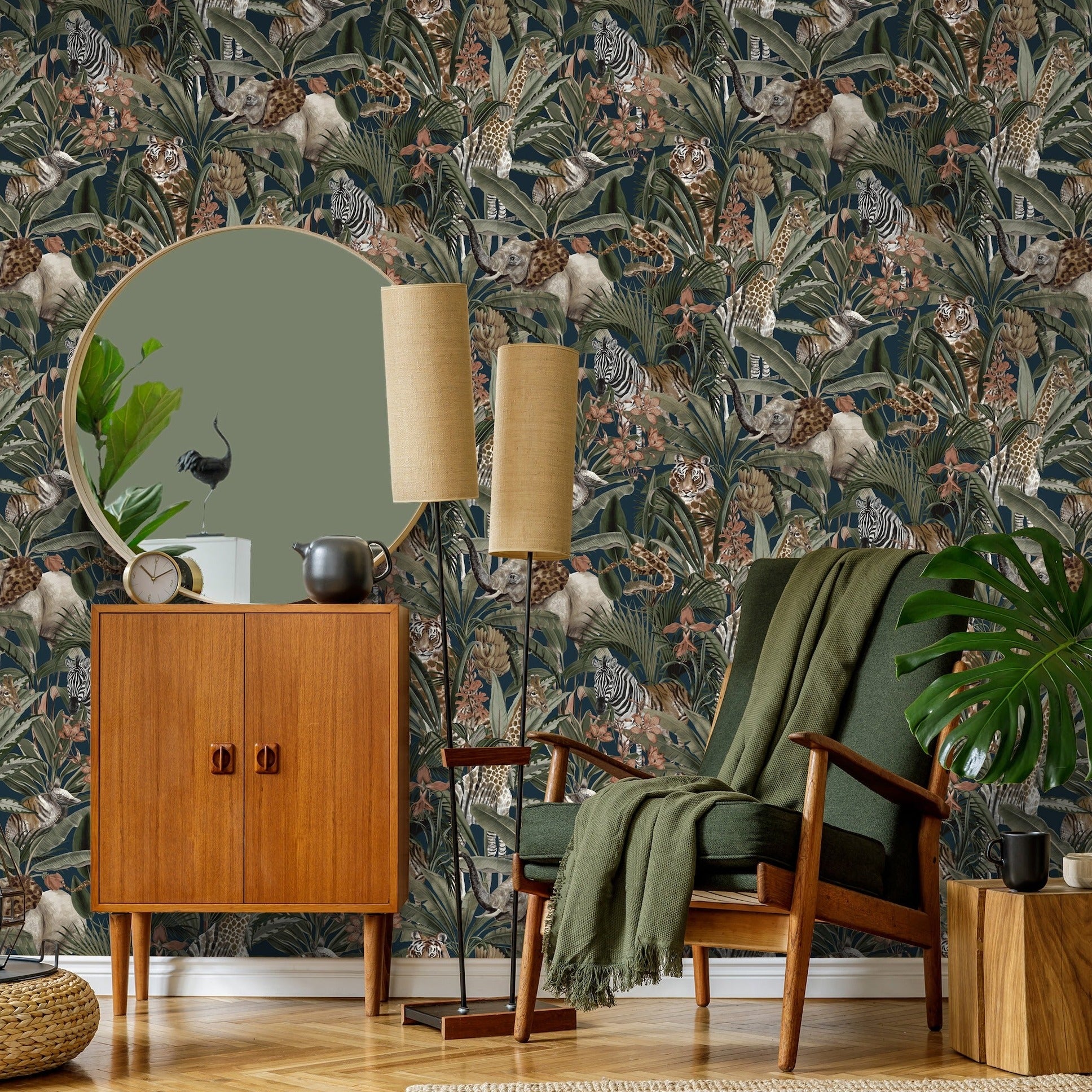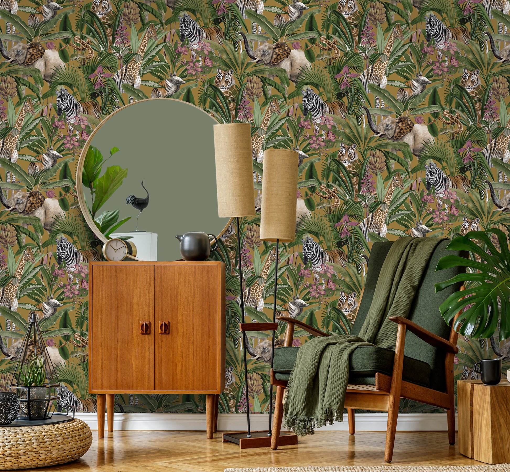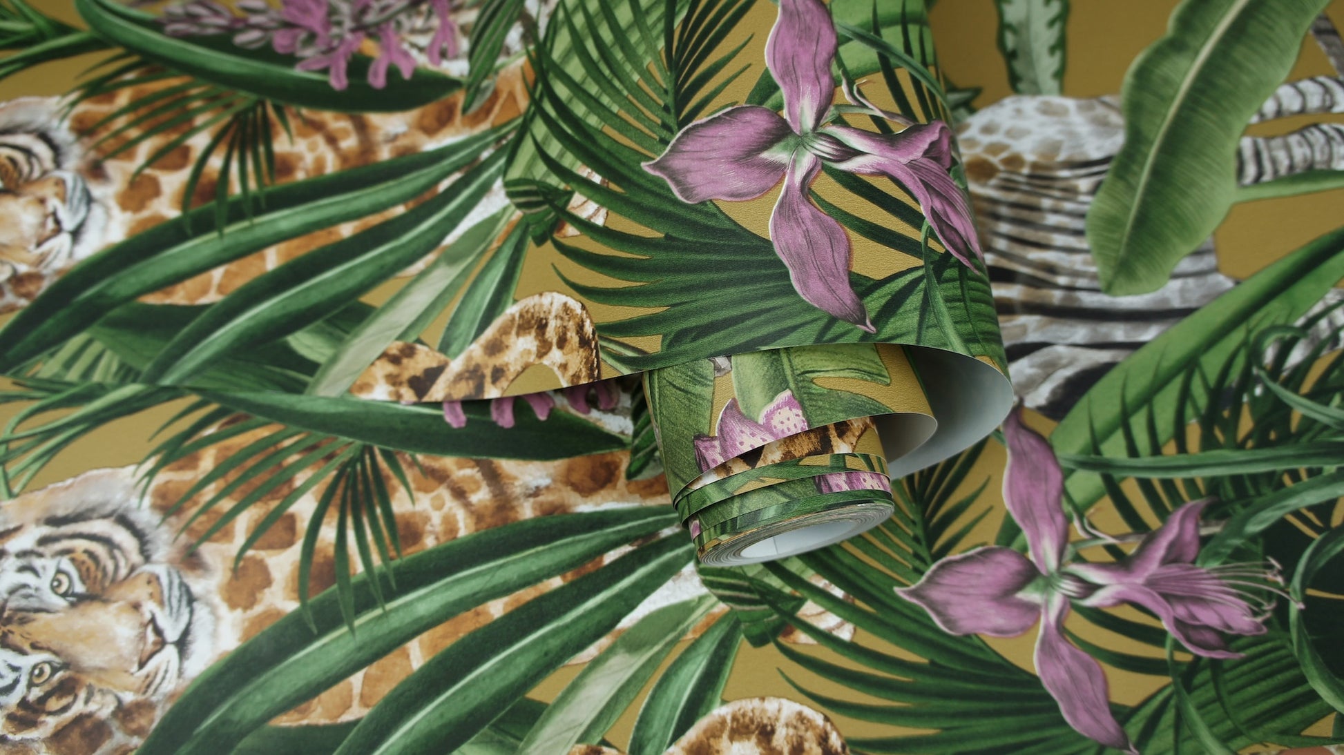 A detailed, jungle-inspired wallpaper featuring Zebras, Giraffes, and Snakes.