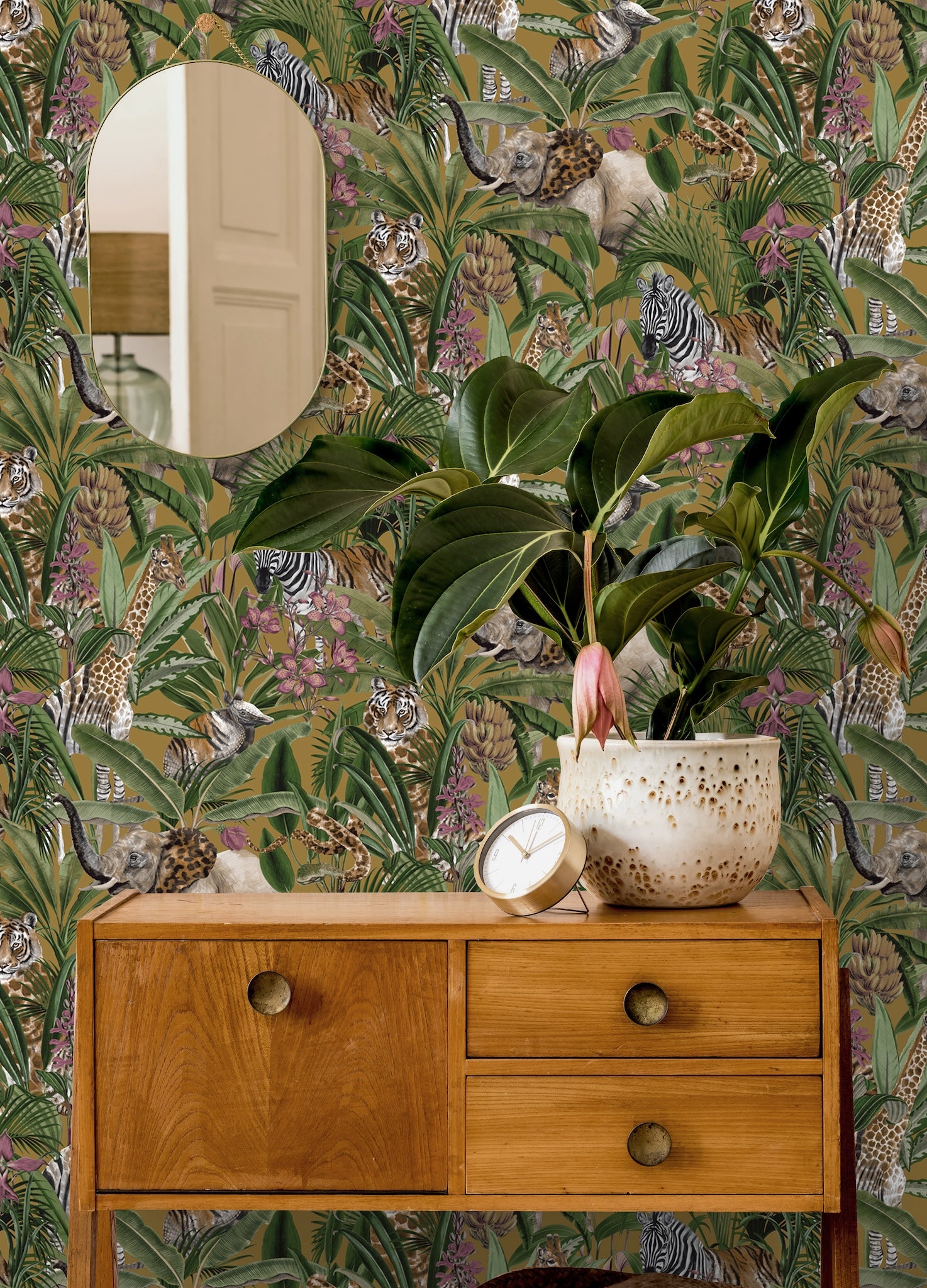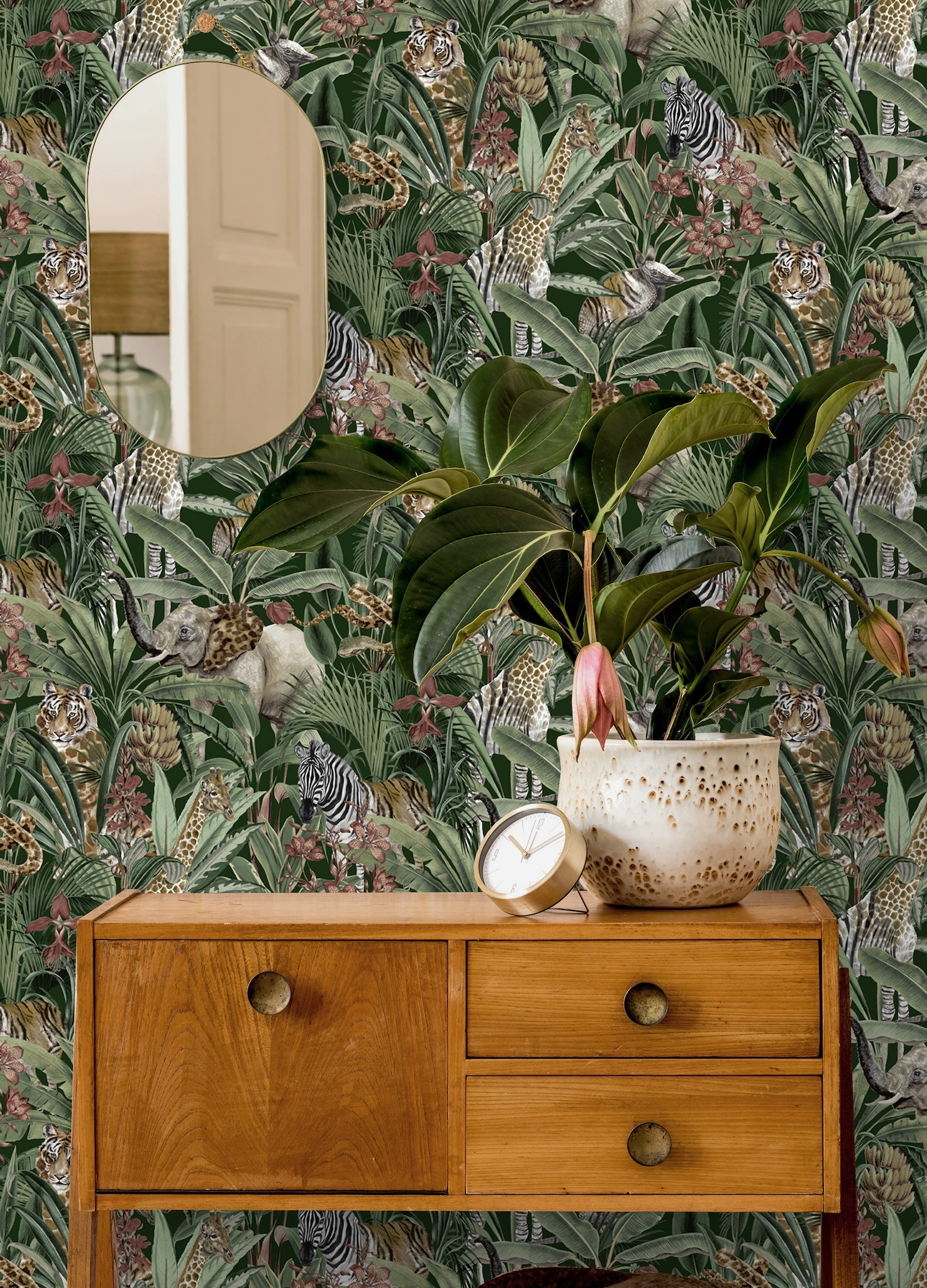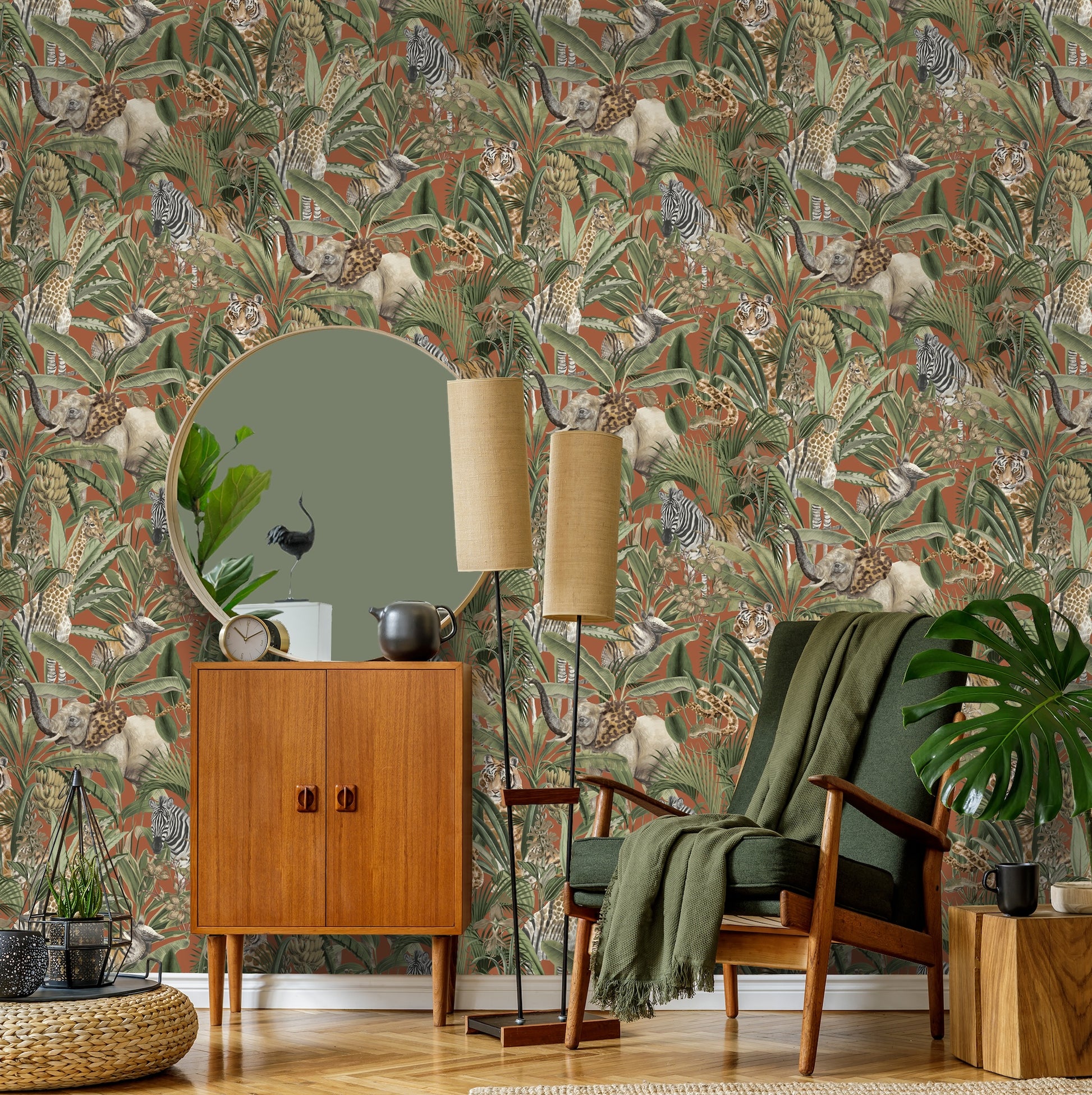 A detailed, jungle-inspired wallpaper featuring Zebras, Giraffes, and Snakes.