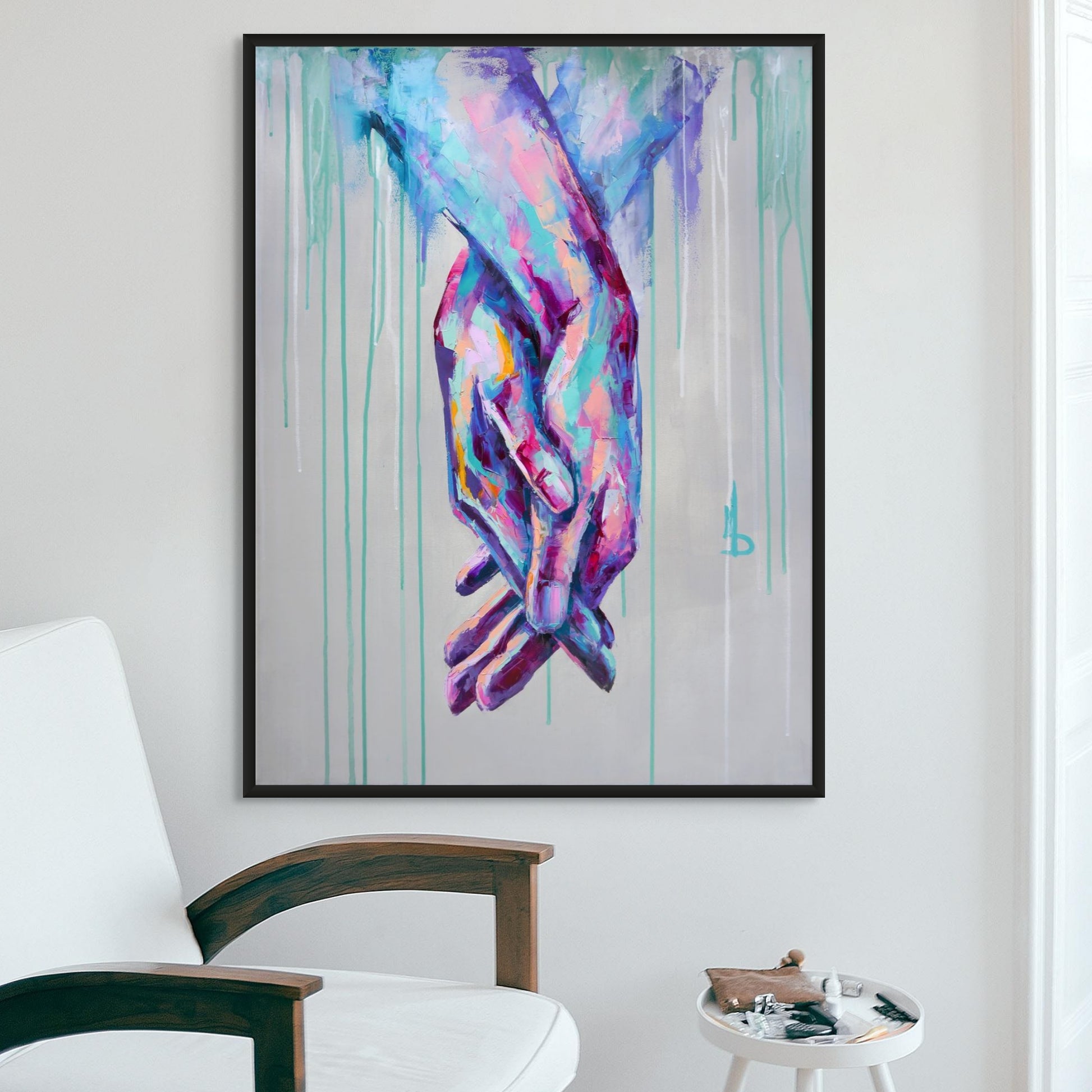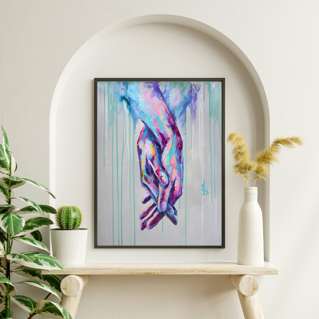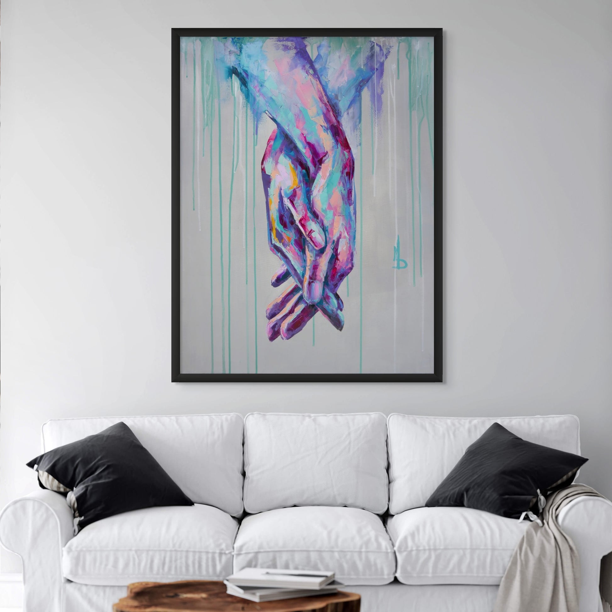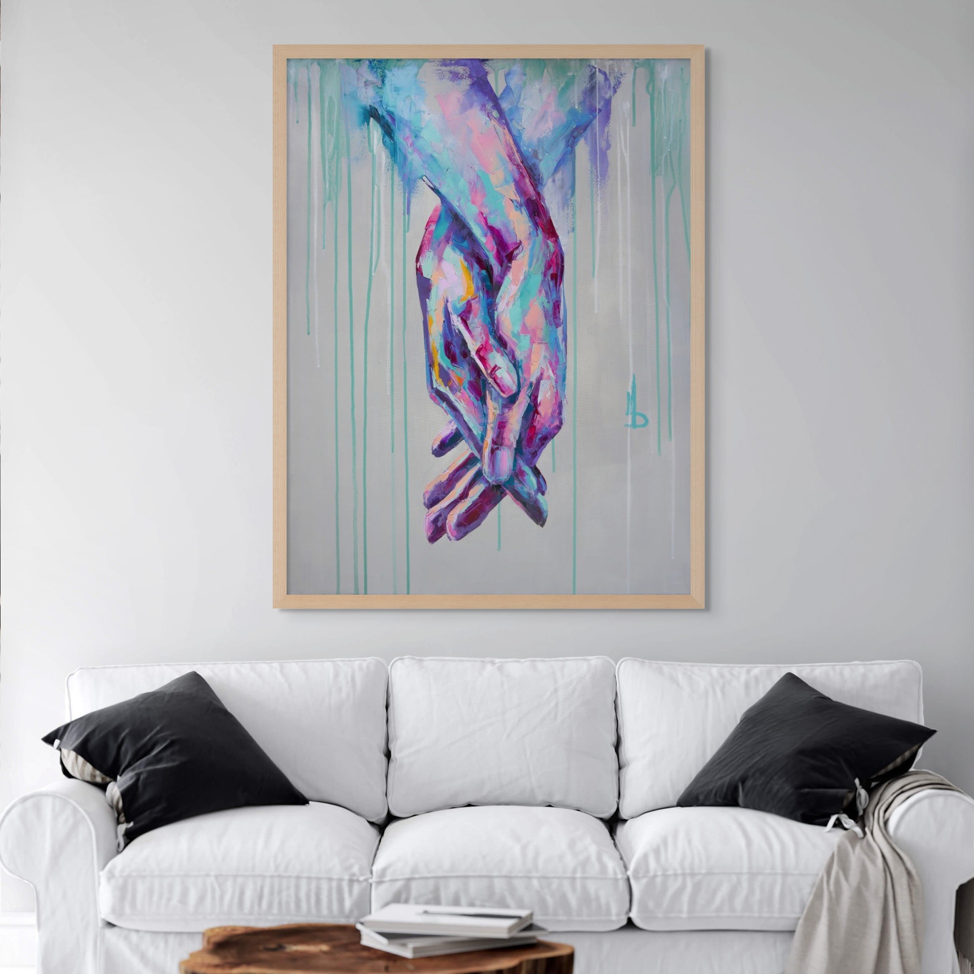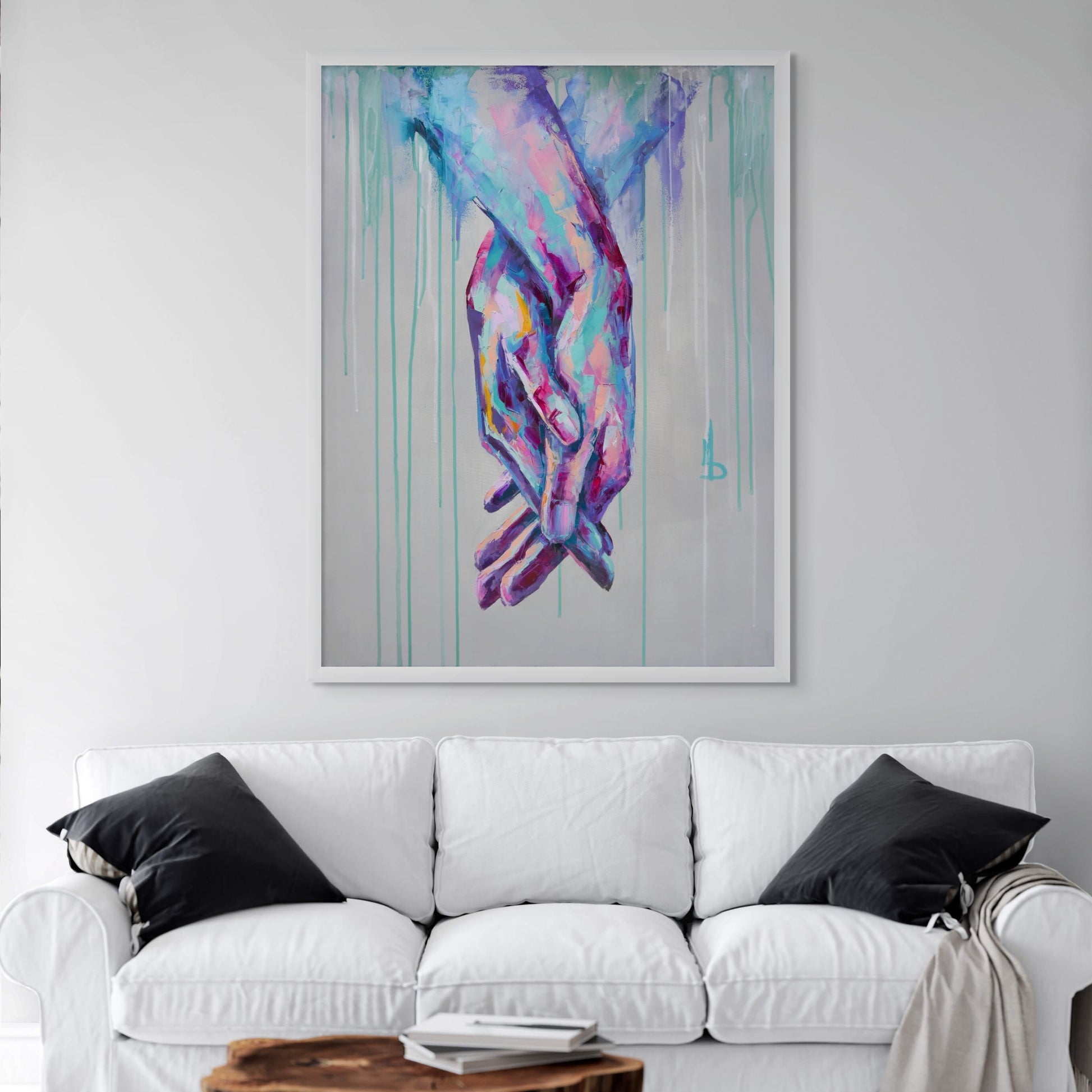 Hand in Hand is a gorgeous contemporary artwork featuring holding hands in shades of blue and purple. The perfect focal point for your home. Available in 3 sizes.