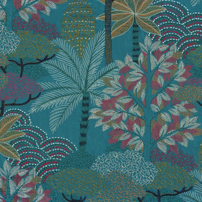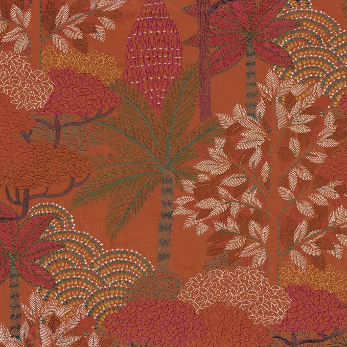 It begins with the tentative chirping of one bird. Then a whole chorus erupts from these imaginary trees, coloured like the feathers of peacocks and birds of paradise. “Voyage imaginaire” introduces a landscape at dawn, when nature reawakens. With small Impressionist strokes, the colours come together and merge into flamboyant bushes. Dawn breaks to reveal the beauty of the landscape and, on the fabrics, plumage, colours, and foliage become one.